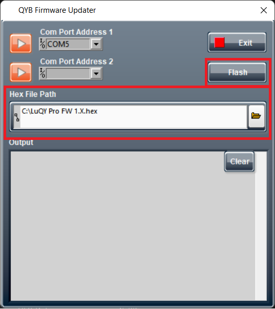 - Select the new firmware hex-file and click the flash button (the two play buttons should be orange as shown right. This means that the software automatically selects the correct COM ports for firmware upload).